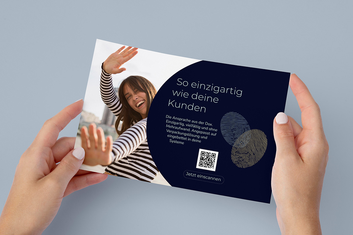 Kostengünstig, simpel, aber trotzdem persönlich. Perfekt als Beilage in bestehenden Verpackungen oder zum gezielten Verteilen auf Events. Deine bestehenden Abläufe bleiben, die Personalisierung kommt dazu für maximalen Impact. Verknüpfe deinen Inhalt mit dem dynamischen QR-Code und verwandle jeden Flyer in eine persönliche Kundenerfahrung.